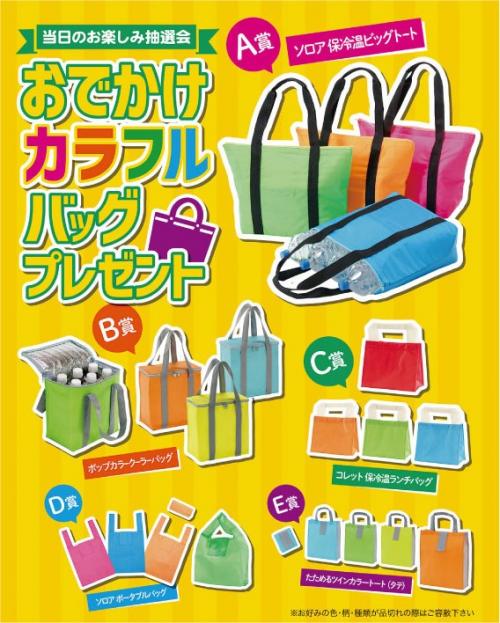 A賞:ソロア保冷温ビッグトート×4コ/B賞:ポップカラークーラーバッグ×8コ/C賞:コレット保冷温ランチバッグ×8コ/D賞:ソロアポータブルバッグ×10コ/E賞:たためるツインカラートート(タテ)×20コ/A3ポスター/抽選箱/くじ50枚/店頭用お知らせPOP2枚