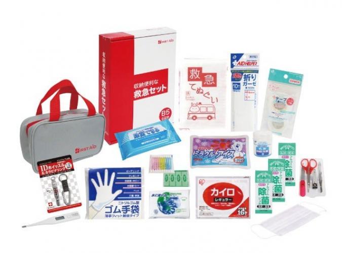 収納ポーチ・カイロ・包帯・テープセット・除菌ジェル×3・IDホイッスル&カラビナリング・体温計・折りガーゼ・ゴム手袋・マスク1P・絆創膏5P・綿棒10P・水に流せるペーパー・除菌アルコールウェットティッシュ・瞬間冷却パック・爪切り・爪やすり・毛抜き・はさみ・救急てぬぐい
