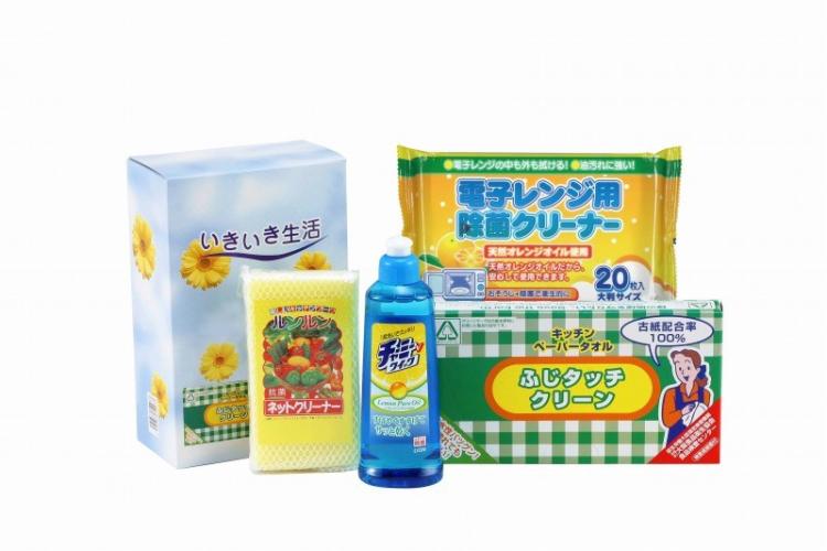 ライオンチャーミーVクイック260ml×1、ルンルンネットクリーナー(ピンク・ブルー・イエローのアソート)×1、除菌レンジクリーナー20枚×1、ふじタッチクリーンキッチンペーパータオル50枚×1