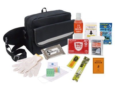 ショルダーとウエストの2WAYタイプの収納バッグの防災セットです。