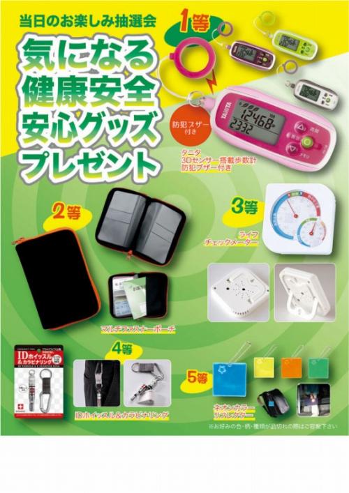1等:タニタ 3Dセンサー搭載歩数計 防犯ブザー付き×1/2等:マルチファスナーポーチ×2/3等:ライフチェックメーター×3/4等:IDホイッスル&カラビナリング×4/5等:ネオンカラーリフレクター×90/A3ポスター/抽選箱/くじ100枚/店頭用お知らせPOP2枚