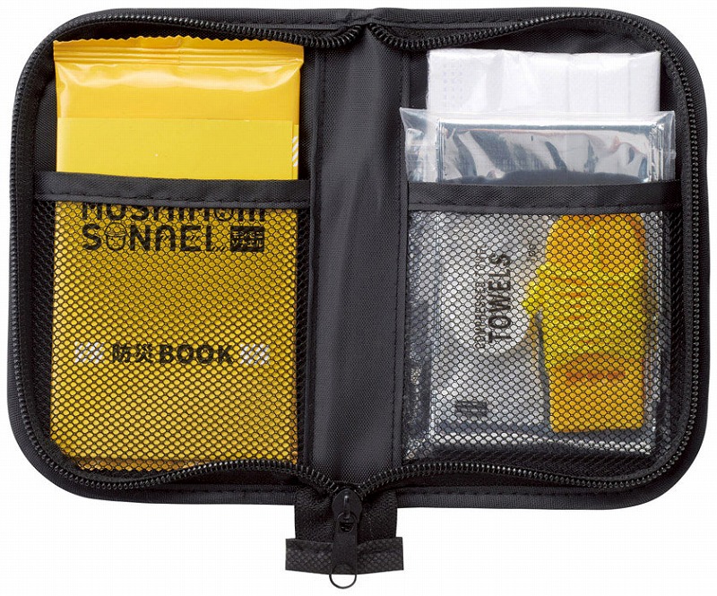 セット内容/ポーチ・圧縮タオル(200×200mm)・アルミシート(1400×700mm)・ウェットティッシュ・ホイッスル・不織布マスク・防災ブック