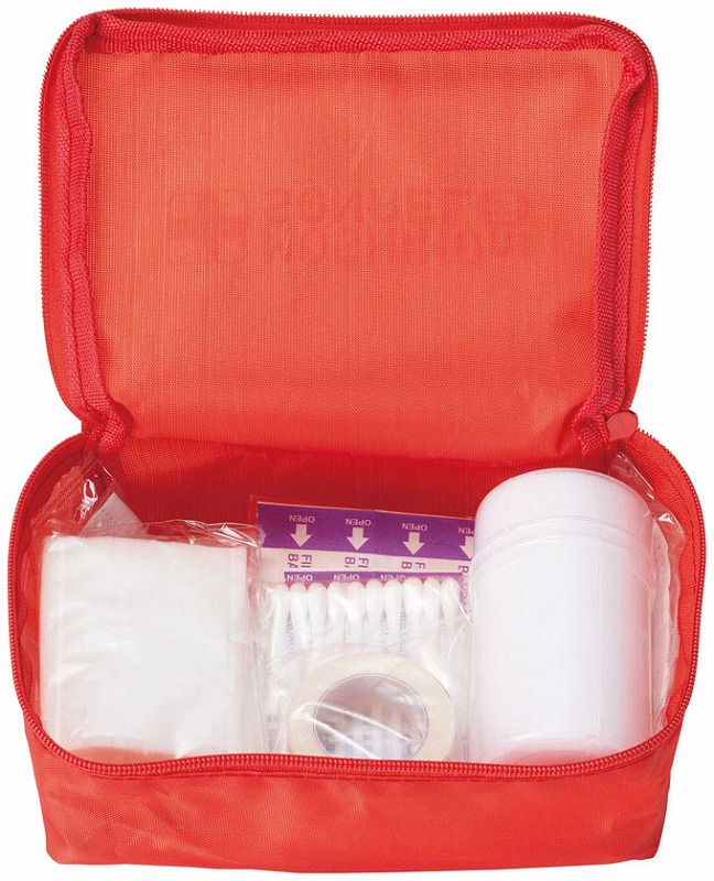 セット内容/ばんそうこう大×4・小×2・カット綿×6・綿棒×10・ウェットティッシュ・不織布マスク・テープ・包帯・ポーチ