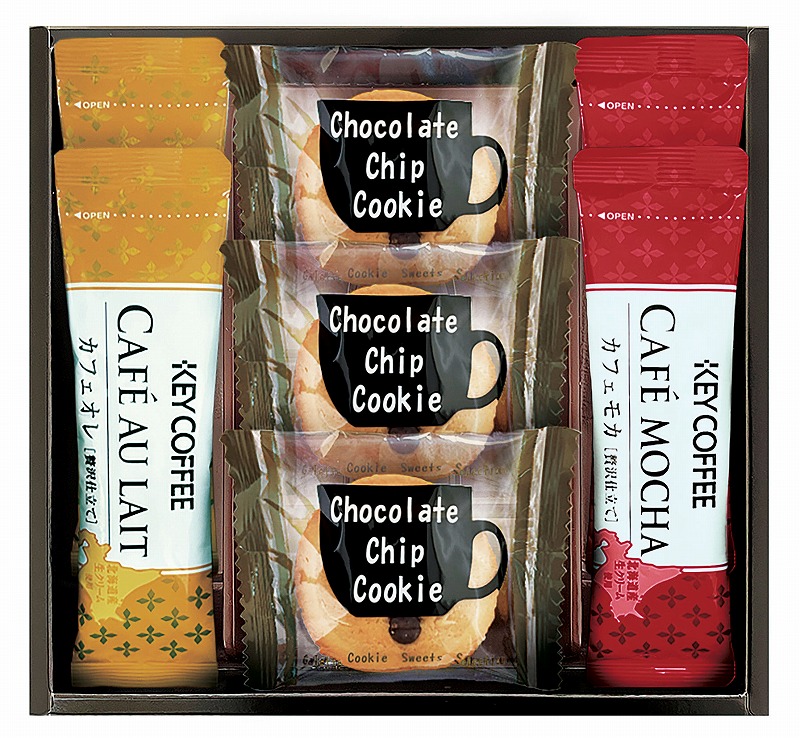 キーコーヒーカフェオレスティック7g×2個、キーコーヒーカフェモカスティック7.8g×2個、チョコチップクッキー×3個