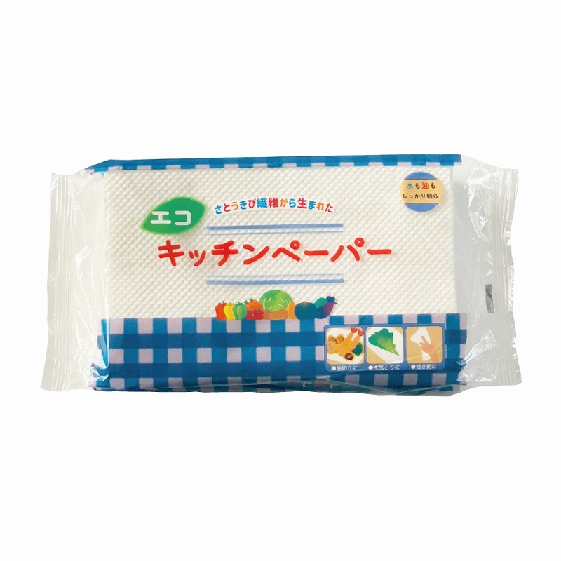 サトウキビの絞り終えた繊維、バガスパルプを利用した環境にやさしいキッチンペーパーです。