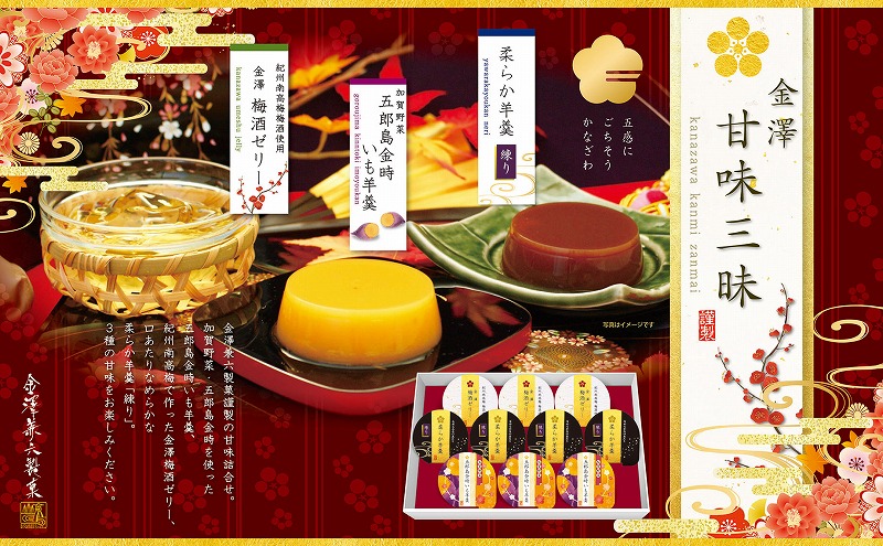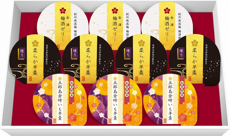 柔らか羊羹練り 60g×4個、金澤梅酒ゼリー 52g×3個、五郎島金時いも羊羹 60g×3個