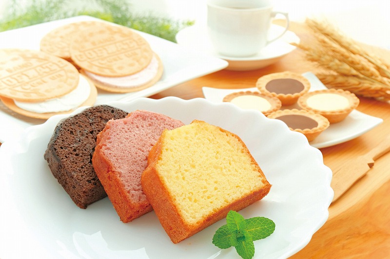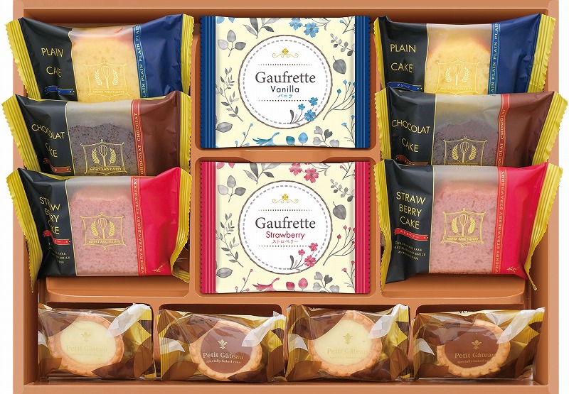バニラゴーフレット×4枚、ストロベリーゴーフレット×4枚、プレーンケーキ×2個、ストロベリーケーキ×2個、ショコラケーキ×2個、プチガトーミルクチョコ×2個、プチガトーホワイトチョコ×2個