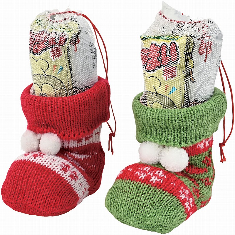 かわいいニットブーツにお菓子を2個セットしました。[内容]スナック菓子2種[アレルゲン]小麦・乳成分・大豆・落花生[賞味期限:製造日含め150日]