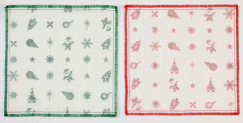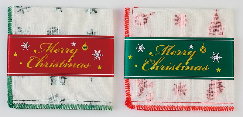 吸収性がよく、汚れをすばやく拭き取るクリスマス柄のかや織りテーブルふきんです。