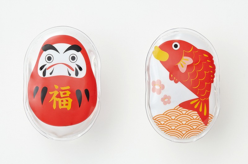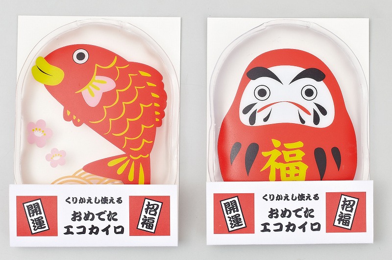 くり返し使えるエコロジーなカイロです。縁起の良いダルマと鯛の絵柄がハッピーなノベルティです。