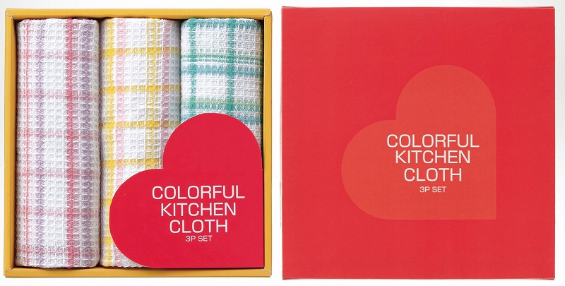 カラフルなキッチンクロスをギフト箱に3枚セットしました。毎日使うものだからとても喜ばれるプレミアムです。