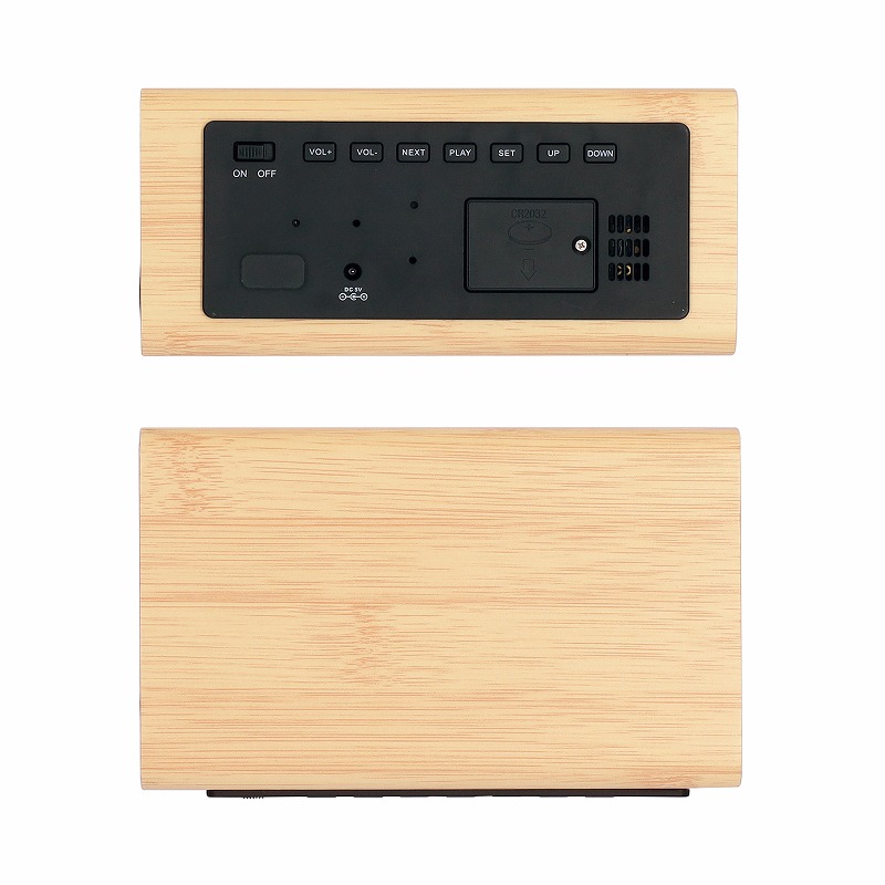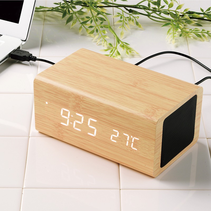 ワイヤレス接続のスピーカーとして。木目調のディスプレイにデジタル時計が浮かび上がり、インテリアとしても素敵。