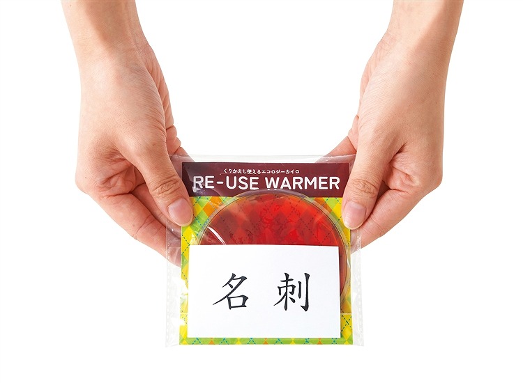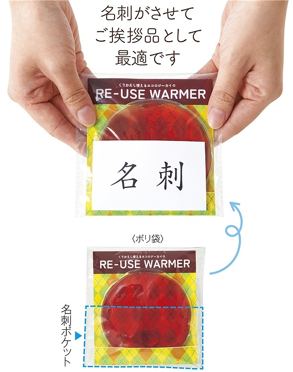 金属ボタンをパチっとすればたちまちあたたかくなり、使用後は煮沸でくり返し使えるエコなカイロ。名刺ポケットがついた個包装袋が便利。名刺やショップカード、クーポン券なども挿せて販促品にも最適です。冬のご挨拶品としてもおすすめです。