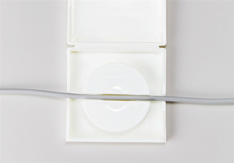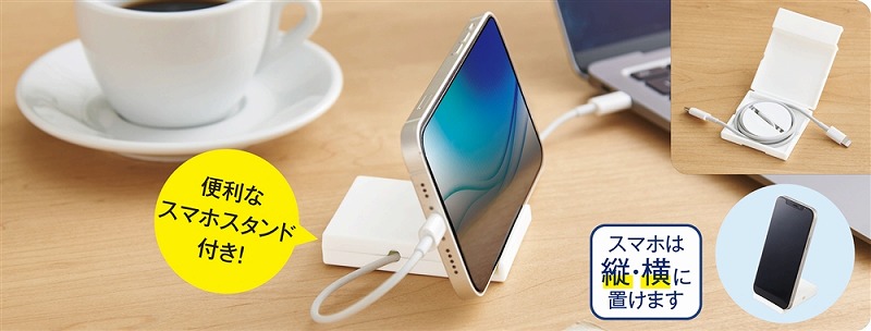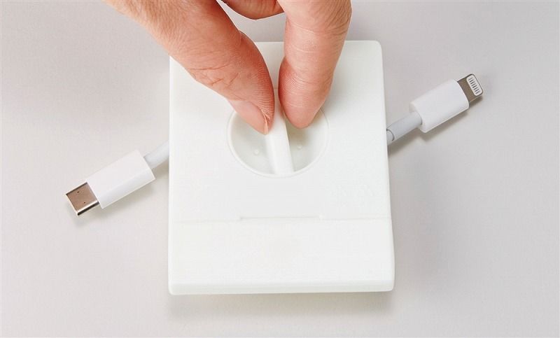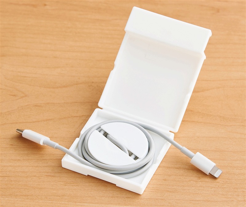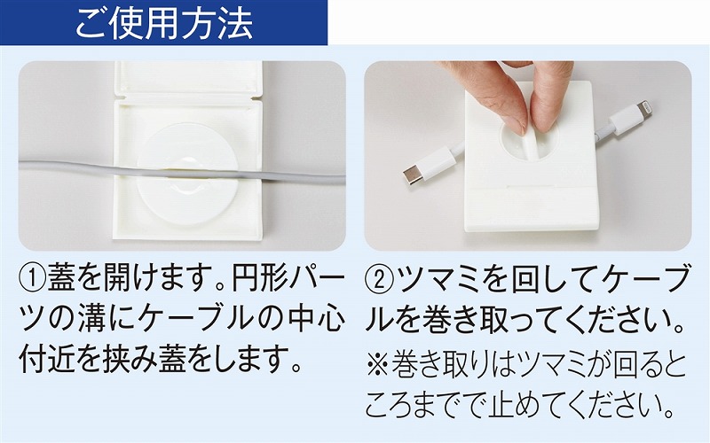 本体のふたを開けてケーブルをセット→ふたを閉めてつまみを回してコードを巻き取ります。 ※USBケーブルは付属しておりません。