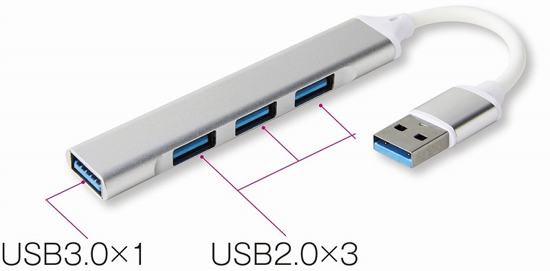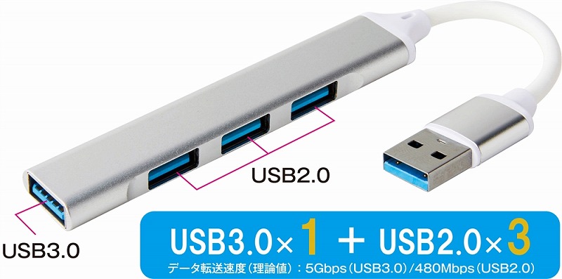 最大4つの同時接続に対応(USB3.0×1箇所、USB2.0×3箇所)。 USB3.0対応で高速データ転送可能。 ※データ転送速度(理論値):5Gbps(USB3.0)/480Mbps(USB2.0)。