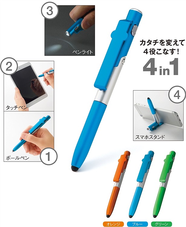 ボールペン、タッチペン、ペンライト、スマホスタンド。1本で4つの機能。便利な多機能ボールペン!