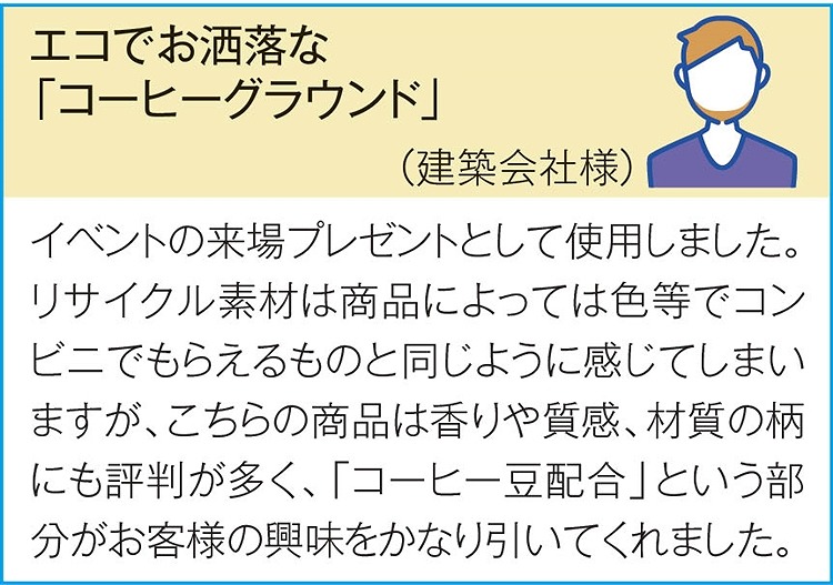 SDGsの目標「海の豊かさを守ろう」につながる、プラスチック削減や3R+Renewableに該当する素材を使用。本来であれば廃棄されるはずの、コーヒーを抽出した後に残る豆かすを使用すること(リサイクルコーヒーグラウンド)で、廃棄物の削減や合成樹脂の使用量を抑えるアップサイクル商品です。
