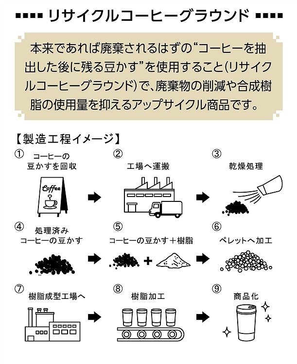 SDGsの目標「海の豊かさを守ろう」につながる、プラスチック削減や3R+Renewableに該当する素材を使用。本来であれば廃棄されるはずの、コーヒーを抽出した後に残る豆かすを使用すること(リサイクルコーヒーグラウンド)で、廃棄物の削減や合成樹脂の使用量を抑えるアップサイクル商品です。