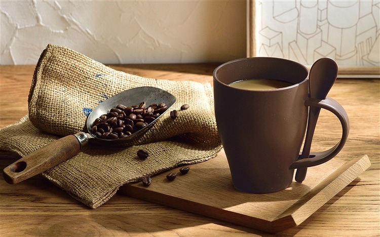 樹脂のなかに使用済みのコーヒーの豆かすを練り込み、再利用したアップサイクルなスプーン付きマグカップ