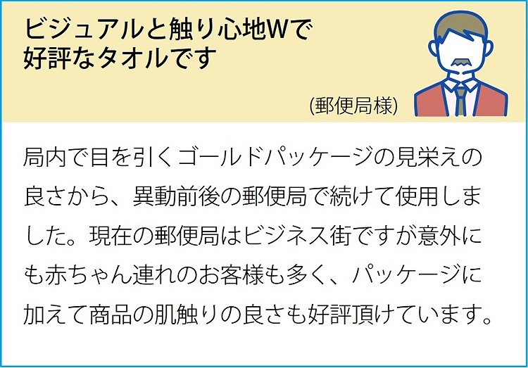 高級感あふれる肌触りのタオルセット。ゴージャスなゴールドパッケージに入ったプレミアムシリーズは、フェイスタオルとウォッシュタオルの2種セット。シックなカラーは贈り物にぴったりで、何枚あっても困らない定番アイテム。イベント会場などに並べても一層目を引きます。