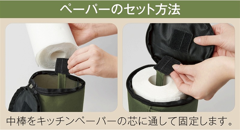 外ごはんにあると便利なキッチンペーパーをしっかりホールド!内側にある中棒をペーパーの芯に通して固定します。持ち運び時も使用時もキッチンペーパーが汚れるのを防ぐことができるので、キャンプやバーベキューなど屋外調理時に重宝します。名入れに対応しております。アウトドア用品購入特典やご来場特典におススメ!