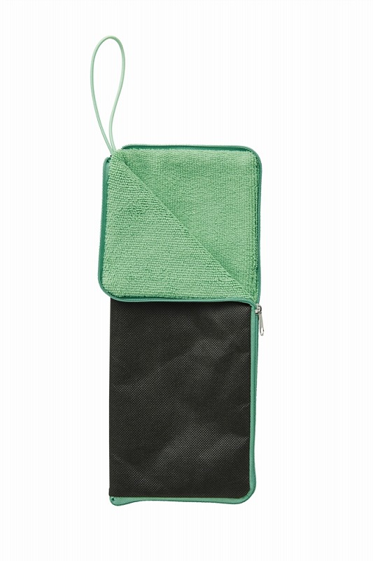 超吸水マルチ傘カバーは、マイクロファイバー製で吸水力抜群。傘カバー・ペットボトルホルダー・タオルと3通りの使い方ができ、濡れた折りたたみ傘や結露したペットボトルの収納に便利。ファスナーを全開にすればハンドタオルに変身し、濡れたバッグを拭くのにも使えます。名入れが目立つパッケージでPR効果が高く、イベントやキャンペーンで配布できるサイズも嬉しい特徴です。