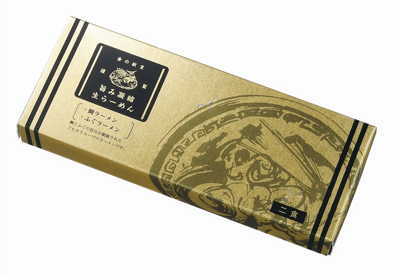 渋く輝くゴールドパッケージに、鯛とふぐの旨味を閉じ込めた贅沢なラーメンを納めました。