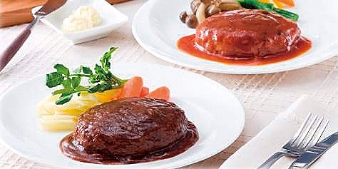 ふっくらした「厚み」をじっくり焼きあげた、荒挽ハンバーグのセットです。
