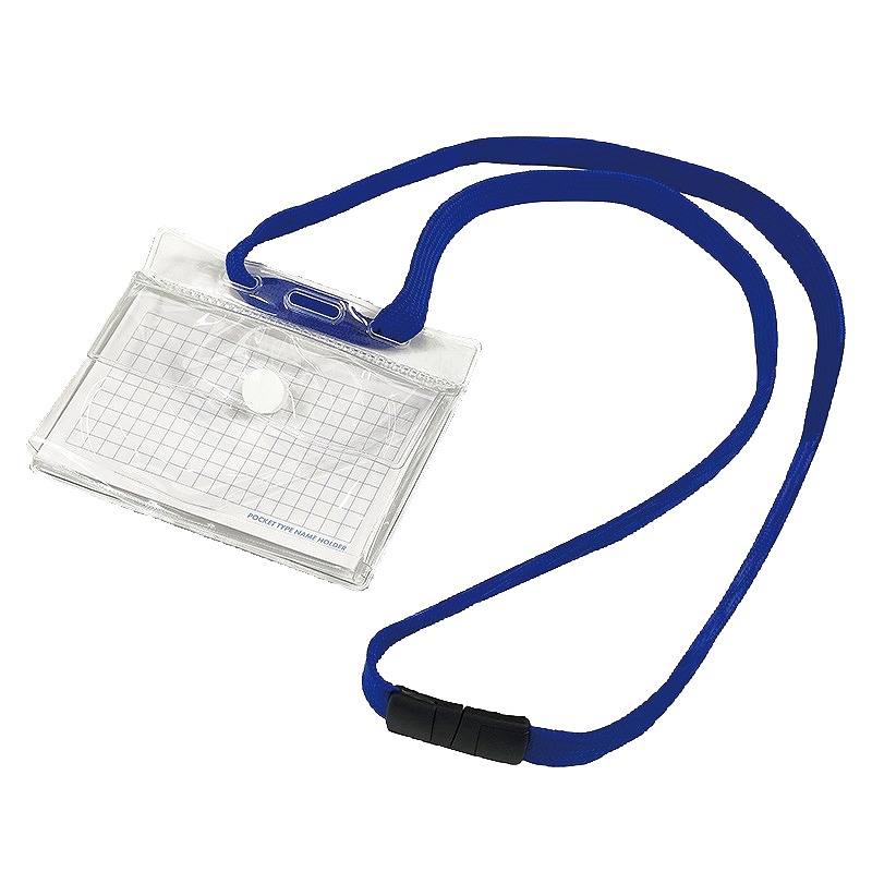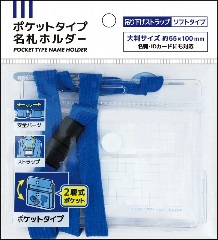 吊り下げストラップは強く引っ張ると外れる安全パーツ式 名札は大判サイズ約65×100mmまで収納可能 裏面は2層式ポケットになっており、コイン・鍵などを収納できます。 販促景品需要だけでなく、オフィスの備品としても。