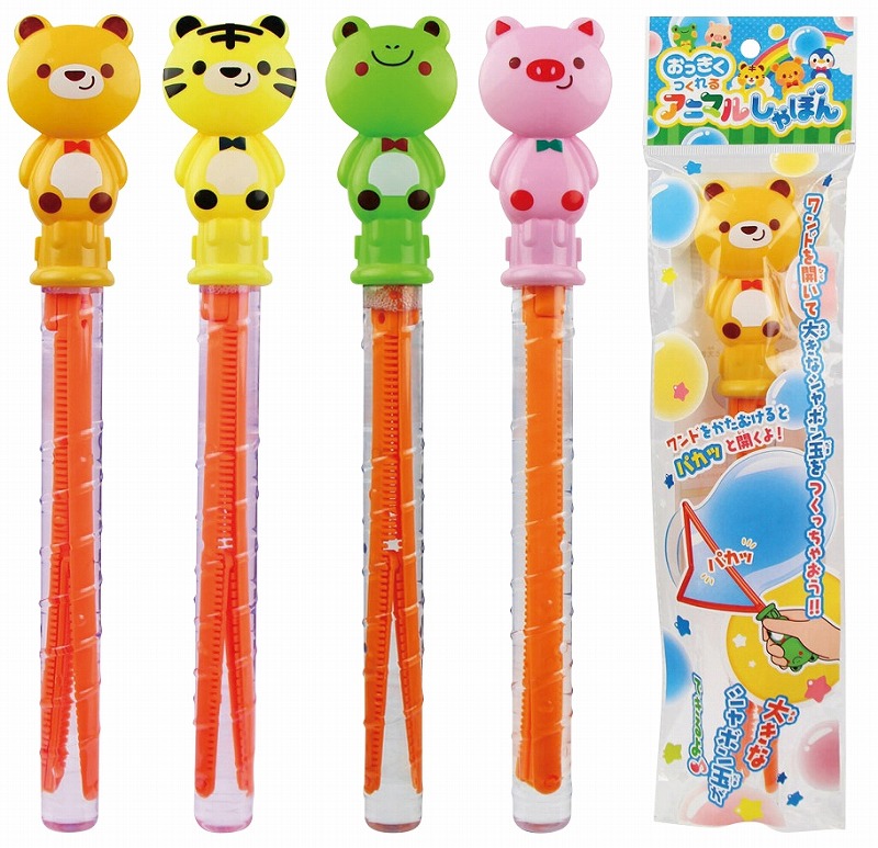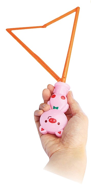 マスコットの付いたスティックを傾けると、パカっと三角形に開き大きなシャボン玉が作れる商品です。