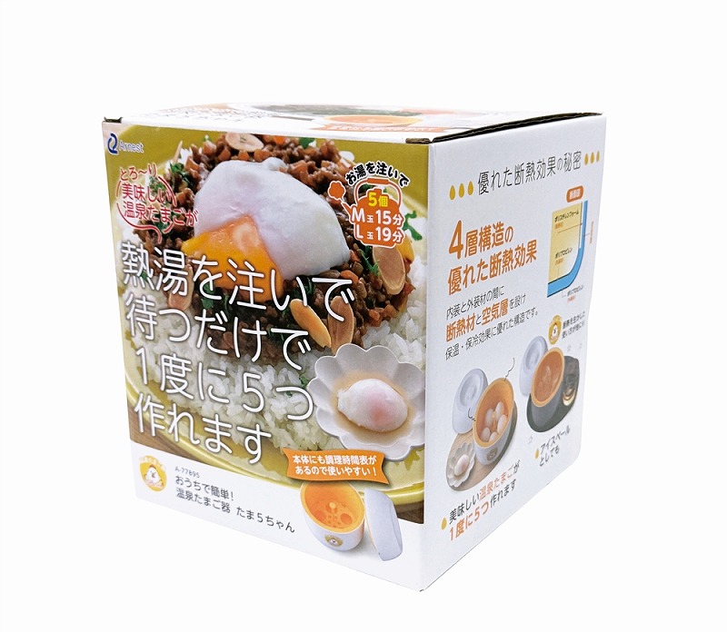 ご家庭で熱湯を注ぐだけで温泉たまごが作れます。温泉たまごのレシピが本体に印刷されているので便利。温泉たまごはそのままでもおいしく頂けますが、サラダやパスタなどのトッピングとしてもお楽しみください。