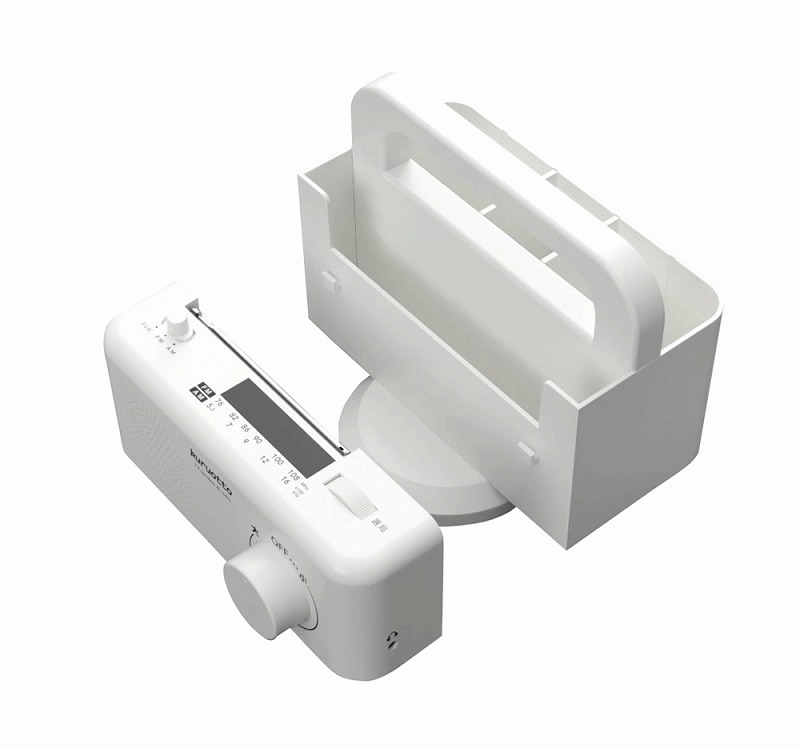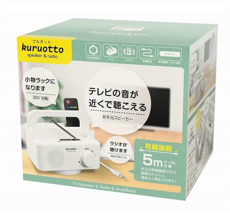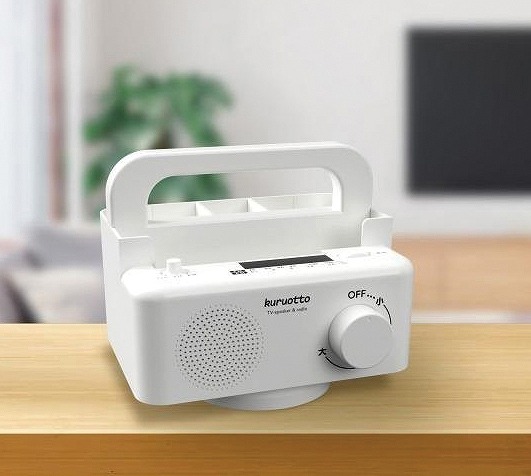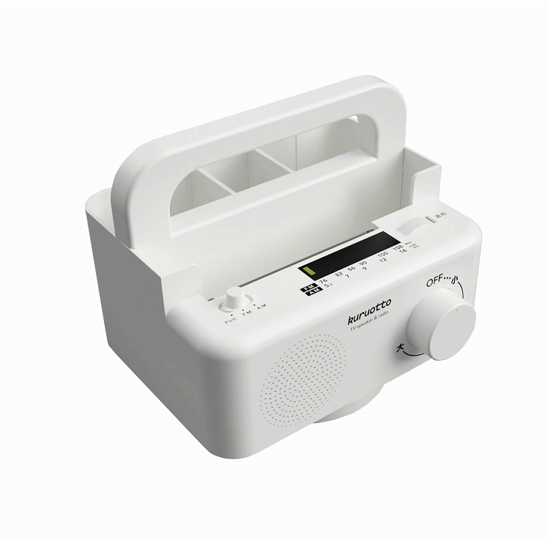 テレビの音が近くで聴こえる。安心の有線接続、遅延なく再生される。ラジオ付きAM/FMワイドがきけます。360°回転する小物ラックつき、移動可能な仕切り板付。携帯やリモコンの収納にもなる。ラジオ部分は取外し可能で、災害時には持ち出すこともできます。