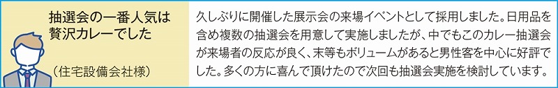 [キット内容] [特賞]兵庫 「三田屋総本家」 三田屋仕立てカレー 8食セット・・・1本 [1等]佐賀「大正屋 椎葉山荘」監修 佐賀牛&ありた鶏カレー 3食セット・・・1本 [2等]福岡 博多The伽哩 2食セット・・・1本 [3等]名古屋本家赤からカレー(中辛)・・・2本 [4等]Hachi たっぷりビーフカレー (中辛)・・・25本 [付属] 抽選くじ×30、抽選箱×1、くじ明細書×1、告知用A4カード×1 ※賞品の内容・仕様は画像と異なる場合があります。あらかじめご了承ください。