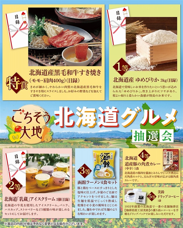 [キット内容] [特賞]北海道産黒毛和牛すき焼き(モモ・肩肉400g)(目録)・・・1本 [1等]北海道産 ゆめぴりか 3kg(目録)・・・1本 [2等]北海道 乳蔵アイスクリーム5個(目録)・・・1本 [3等]函館ラーメン4食セット・・・2本 [4等]北海道 道産豚の角煮カレー(中辛) 1食・・・5本 [5等]美鈴ドリップコーヒー1袋・・・40本 [付属品] 抽選くじ×50、抽選箱×1、くじ明細書×1、告知用A4カード×1 ※賞品の内容・仕様は予告なく変更となる場合がございます。