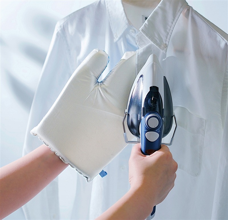 ハンガーに衣類をかけた状態でアイロンがけができるグッズです(スチームアイロン専用)。親指を入れる箇所があり、衣類を抑えた状態でのアイロンがけも可能です。吊るして保管できるループ付き。