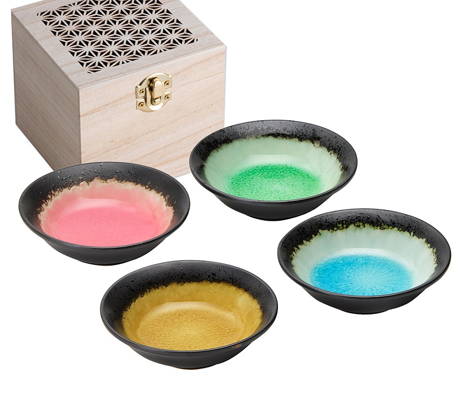 内側に鮮やかなガラス釉をあしらった4色の器は、四季折々の趣を感じさせ料理を引き立てます。透かし彫りの木箱入りです。
