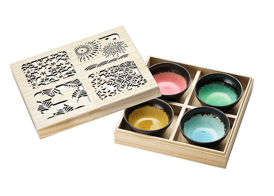 内側に鮮やかなガラス釉をあしらった4色の器は、四季折々の趣を感じさせ料理を引き立てます。透かし彫りの木箱入りです。