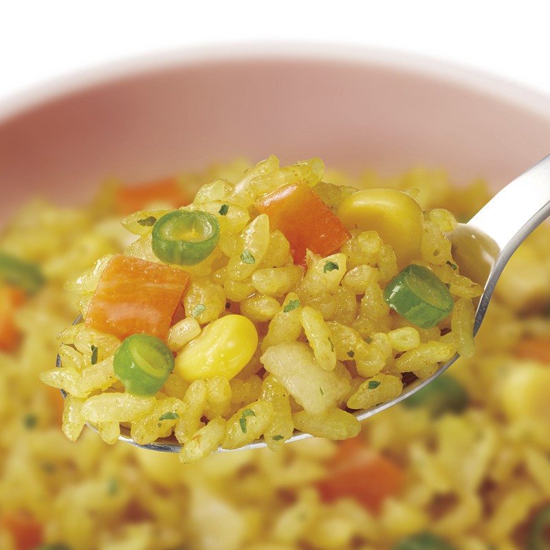 4種の野菜とスパイスのさわやかな香り。お米は国産うるち米のみ使用。アレルギー物質(特定原材料等)28品目不使用。ハラール認証取得商品。