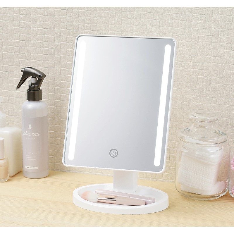 くるっと回転して縦・横の切り替えができます。ミラー内に眩しすぎず、お肌を美しく照らすLEDライトが内蔵。ワンタッチでライトのON/OFFが出来ます。ピアスや化粧品等を仮置きするのに便利なスペース付。
