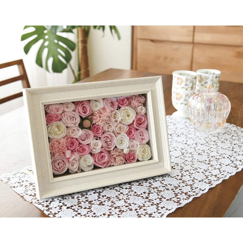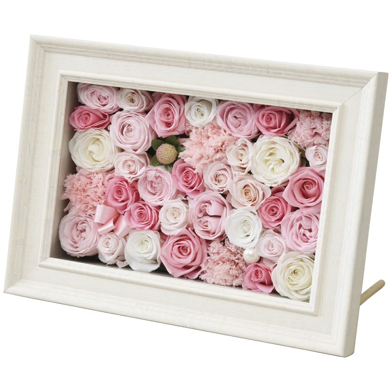 プリザーブドフラワーをフレームにアレンジしました。木足棒がついており、掛置き兼用でご利用いただけます。