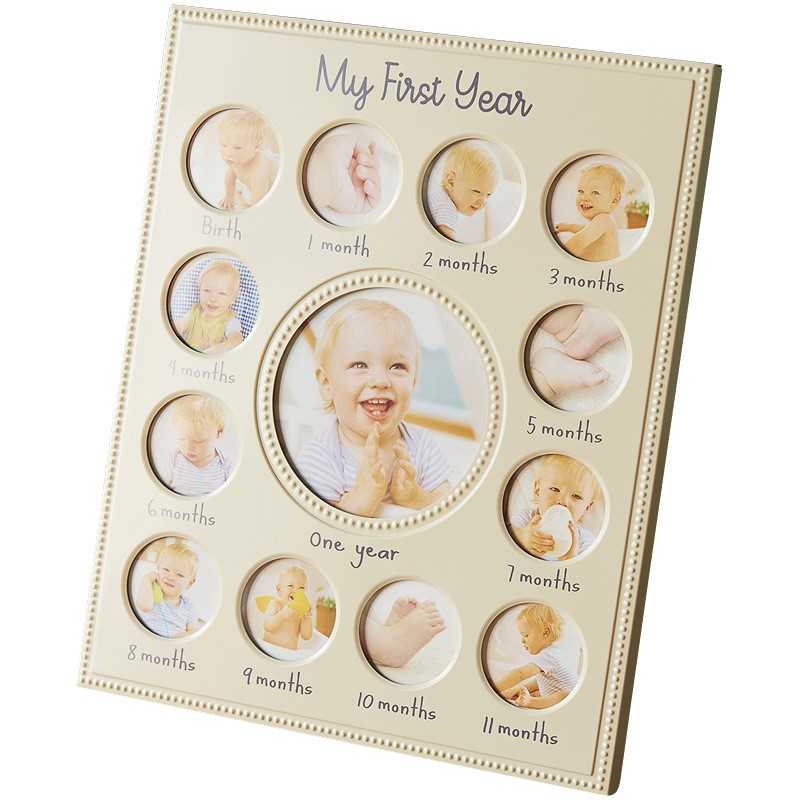 お子様の誕生から1歳になるまでの成長の過程を、ひと月ごとにひとつのフレームにおさめいてくことが出来るフォトフレーム。高級感のあるかわいいフレームに成長記録を収め、とっておきのメモリアルフォトと共に「生まれてくれてありがとう」とお祝いを。
