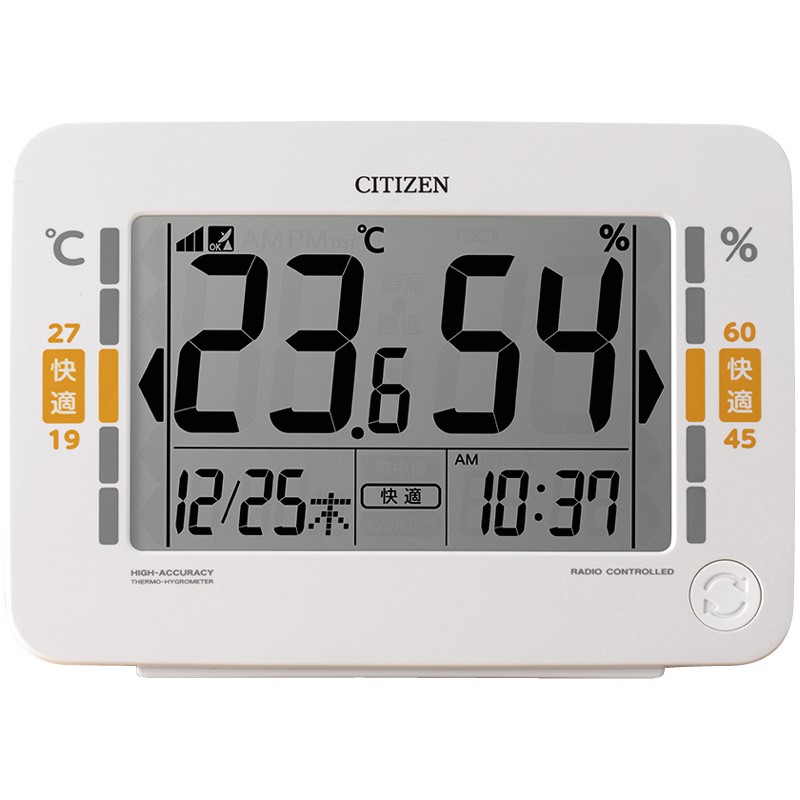 時計付 温度表示(-9.9~50℃) 湿度表示(20~95%) 環境目安表示(「熱中症」「インフルエンザ」「快適」表示タイプ) 24~25時間以内の最低/最高値(温度・湿度)表示機能 カレンダー表示(2099年12月31日まで表示可能)