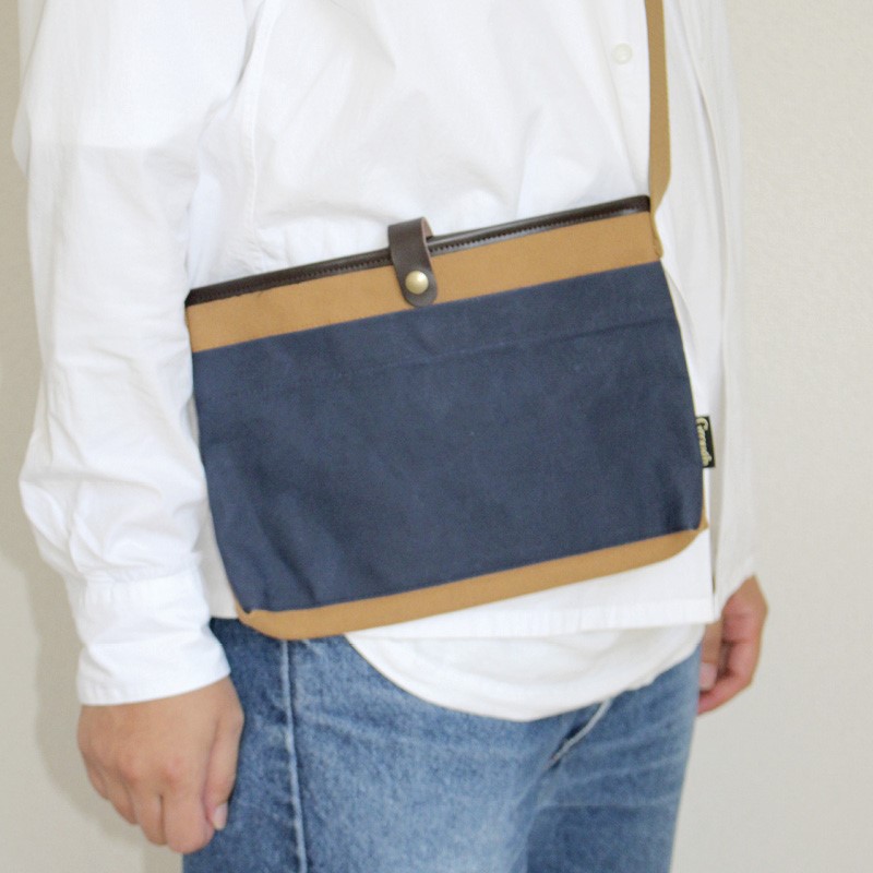 本体:綿(前面ポケット部分のみパラフィン加工)・牛革・合成皮革、ショルダーベルト:アクリル