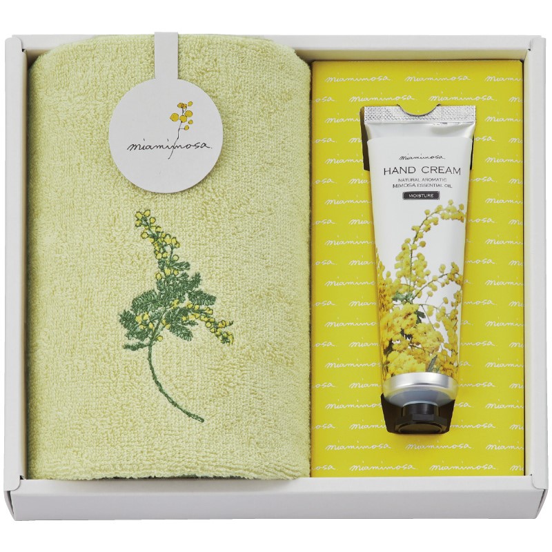 春を告げる花ミモザをモチーフとした今治タオルと、天然香料ミモザ精油がふんわりと柔らかく香る、するすると伸びる滑らかな使い心地のハンドクリームのセットです。ヘーゼルナッツオイルとアロエベラエキス配合でしっかり潤うのにべたつかず、やわらかな手肌へ導きます。