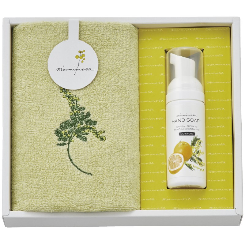 春を告げる花ミモザをモチーフとした今治タオルと、天然香料ミモザ精油とグレープフルーツの香りが爽やかな、アミノ酸系洗浄成分配合のクリーミィーな泡で手肌をやさしく洗い上げるハンドソープのセットです。