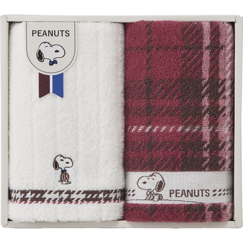 PEANUTS どこか懐かしく、あたたかな雰囲気をもつタータンチェック。チェックファッションに身を包んだスヌーピーがゆったりとティータイムを楽しんでいるアートをさりげなくあしらいました。華やかでありながら、落ち着きがあり心地よさを感じていただけるタオルギフトです。
