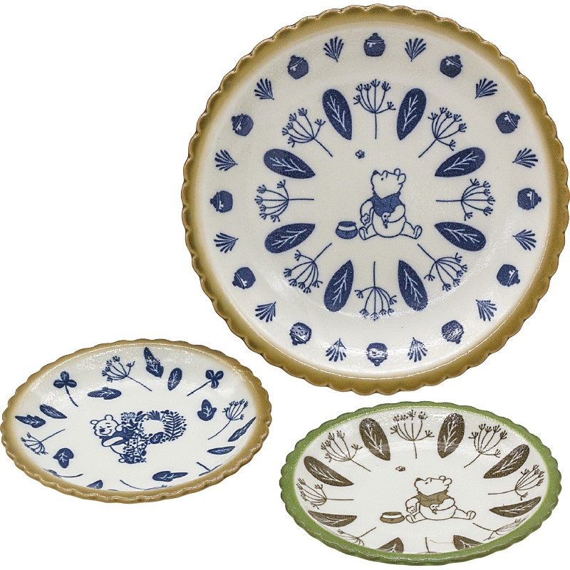 緑豊かな森の中で過ごす、くまのプーさんを描いたテーブルウェア。 さまざまな枝葉モチーフが、自然の恵みを感じさせます。リズミカルに小さなカーブを描く縁の形もユニーク。