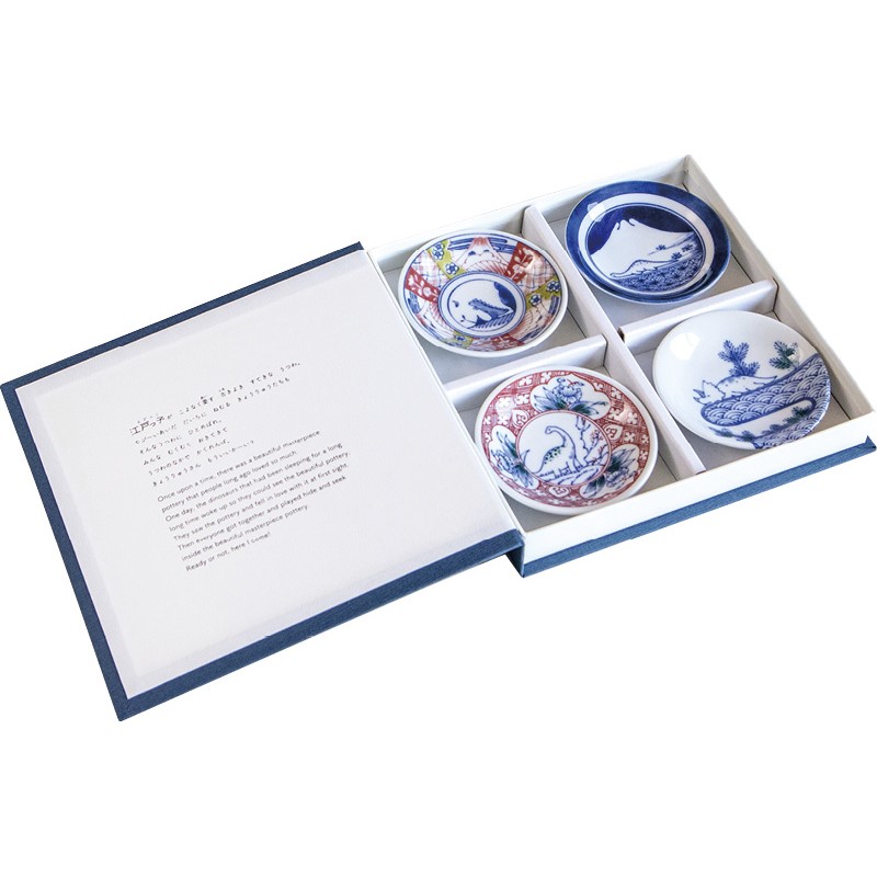 日本の伝統的な文様と地に眠った恐竜たちのコラボレーション!当社が商売を営む岐阜県瑞浪市は、美濃焼の産地として栄えていますが、一方で化石が採れる街としても有名です。古き良き魅力的なの文様のなかに、恐竜がひっそりと潜むユニークなデザインは、きっと新しい物語を紡ぐでしょう。大人から子供まで幅広い世代に愛される一皿に。古典柄に可愛らしい恐竜たちが描かれたまめ皿が集まりました。4枚で「し」あわせの意味を込めて、しあわせの訪れを願ったギフトセットです。ブック型の化粧箱にもこだわり、図鑑を開いた時のような特別感とわくわく感あふれるギフトです。しあわせ図鑑は、もらった時に思わず笑顔がこぼれる一品です。