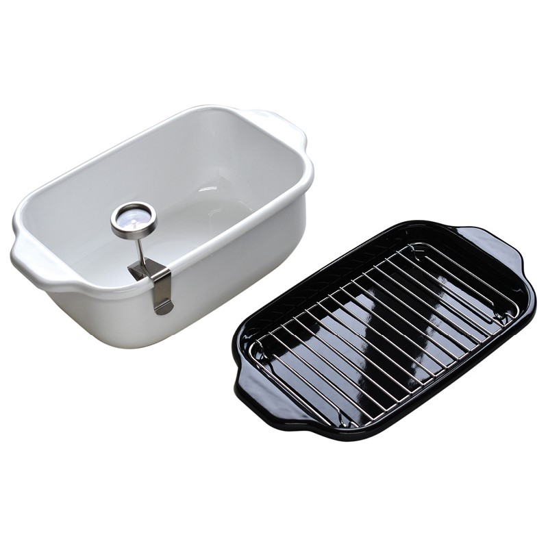小さめでコンパクトなのに長い食材も調理でき効率的。バットとスノコ、防水温度計付き。ほうろう用鋼板にガラス質を焼き付けたホーローは酸や塩分に強く、匂いや汚れもつきにくく洗えばスッキリ落とせ、いつまでも光沢を保ちます。本体、バットはオーブン調理もOK。200VIH対応可能。