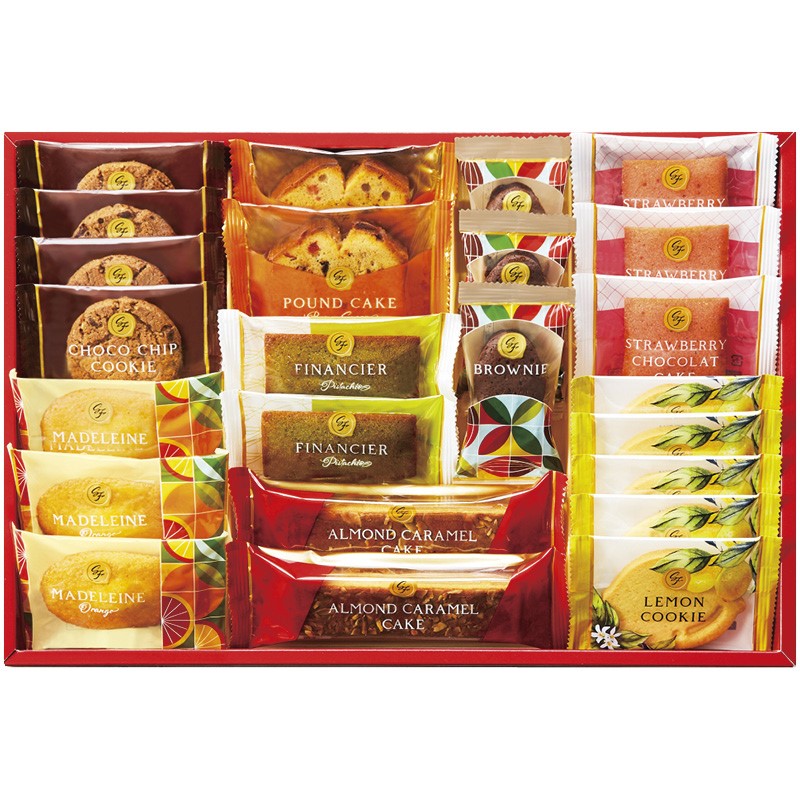 レモンクッキー×5、チョコチップクッキー×4、オレンジマドレーヌ・ストロベリーショコラケーキ・ブラウニー×各3、ピスタチオフィナンシェ・ブラウンシュガーパウンドケーキ・アーモンドキャラメルケーキ×各2